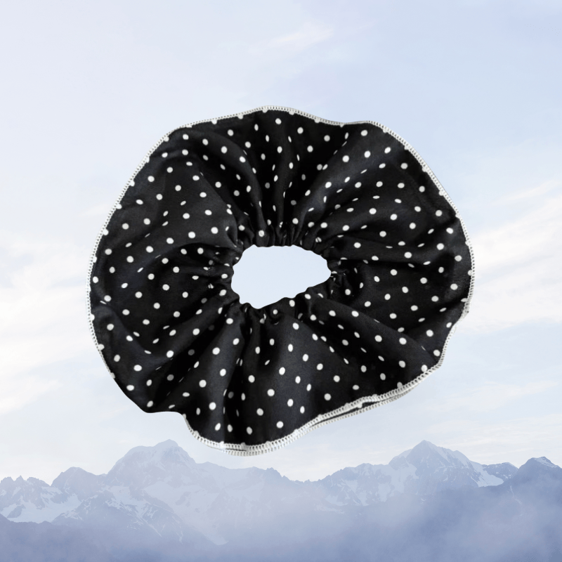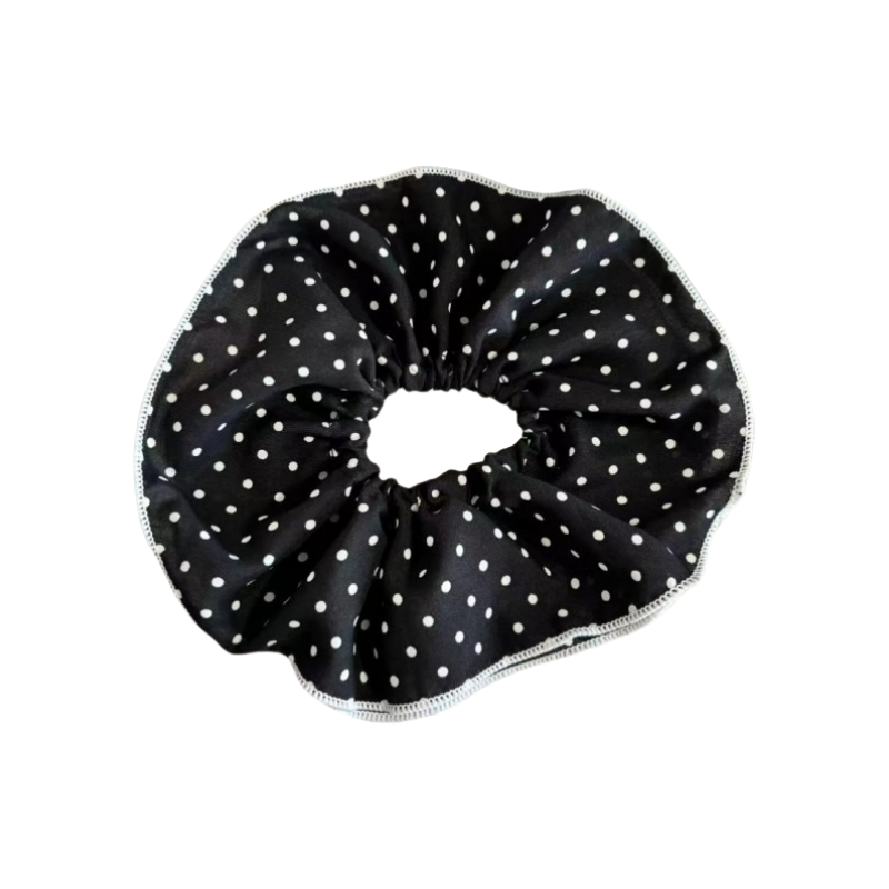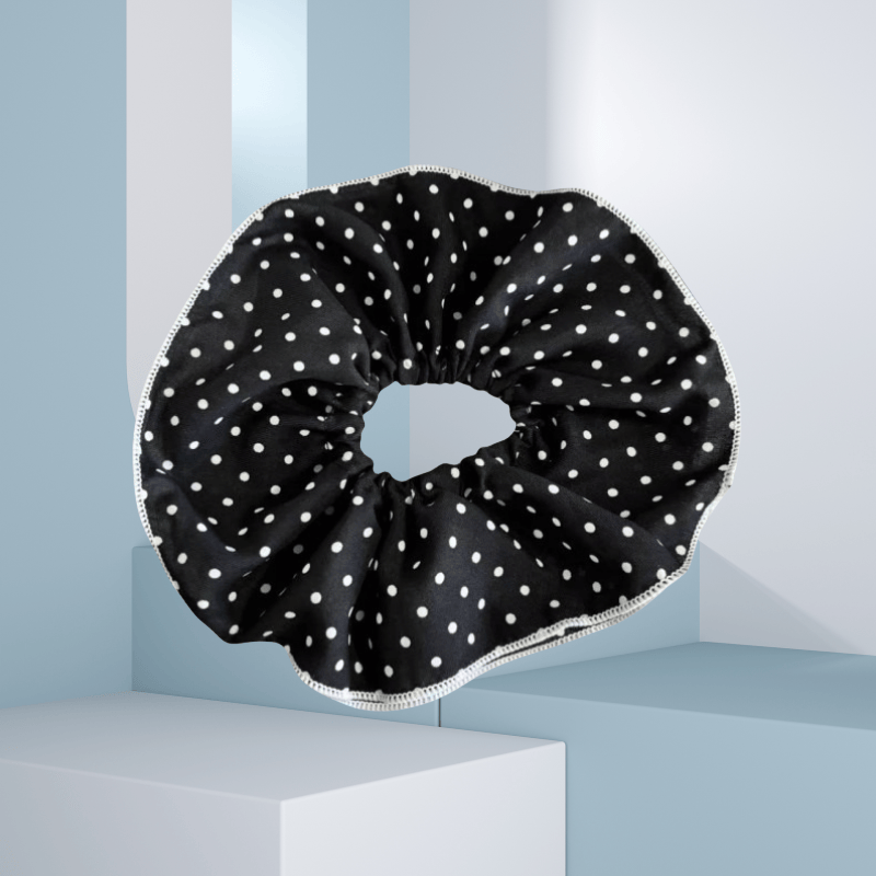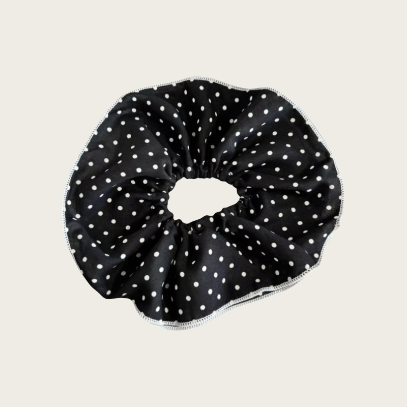 Add playful elegance to your look with the Polka Dot Duo Tie. This scrunchie features two layers of soft, sheer black fabric adorned with classic white polka dots, creating a voluminous and eye-catching silhouette. The layered design brings bounce and texture, while the timeless color palette makes it easy to pair with any outfit. Perfect for dressing up a casual ponytail or adding flair to a messy bun, this scrunchie is both lightweight and gentle on hair. With its bold yet feminine charm, the Polka Dot Duo Tie is a must-have for effortless, everyday style.